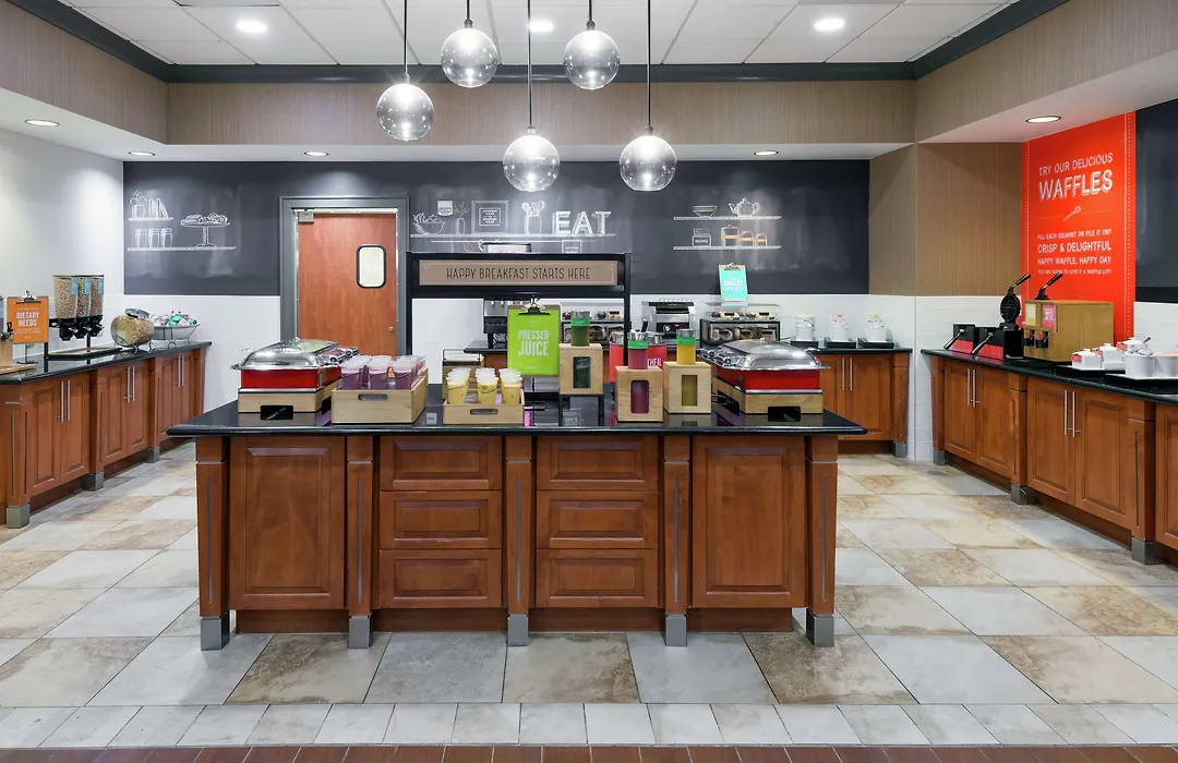 Dining options feature a complimentary hot breakfast daily, which includes coffee, DIY waffles, and fruit. Nearby dining includes Bonchon, IHOP, Carrabba's, and TGI Fridays, all within 0.5 km of the hotel.