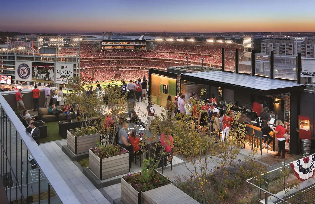 Dining options include the seasonal rooftop restaurant, Top of the Yard Bar & Bites, which offers 360-degree views and ballpark-inspired menus. A basic hot breakfast buffet is available daily, featuring items like eggs, sausage, and a make-your-own waffle station.