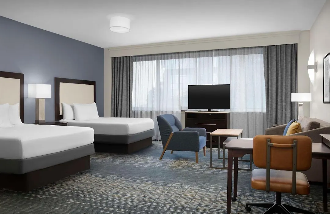 Homewood Suites features 130 accommodations equipped with full kitchens, including a stovetop, refrigerator, and microwave. Rooms also provide a flat-screen TV and large windows with skyline views, ensuring a comfortable stay for guests.