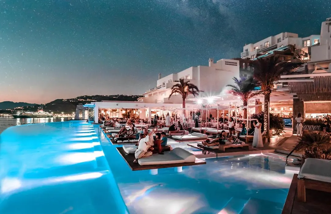 Cavo Tagoo Mykonos, a 5-star hotel rated 9.2/10 on Booking.com, features an infinity pool, a 40-metre aquarium bar, and a fully equipped spa. This Mykonos Town hotel offers luxurious accommodations designed in traditional Cycladic architecture with stunning views of the Aegean Sea.