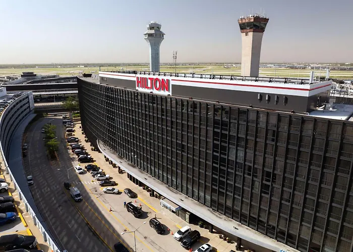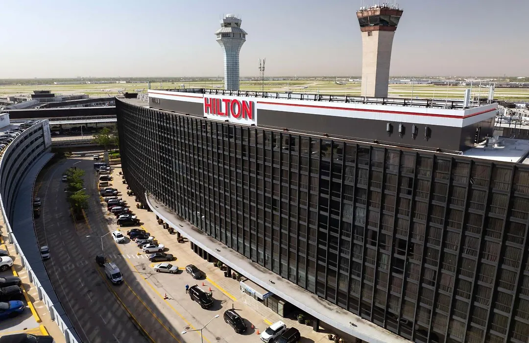 Hilton Chicago O'Hare Airport is a 4-star business hotel with a rating of 7.6/10 on Booking.com. Guests can access the indoor walkway to domestic terminals and the Blue-line train station directly from the hotel. Additional amenities include a 24-hour fitness center and three on-site restaurants.