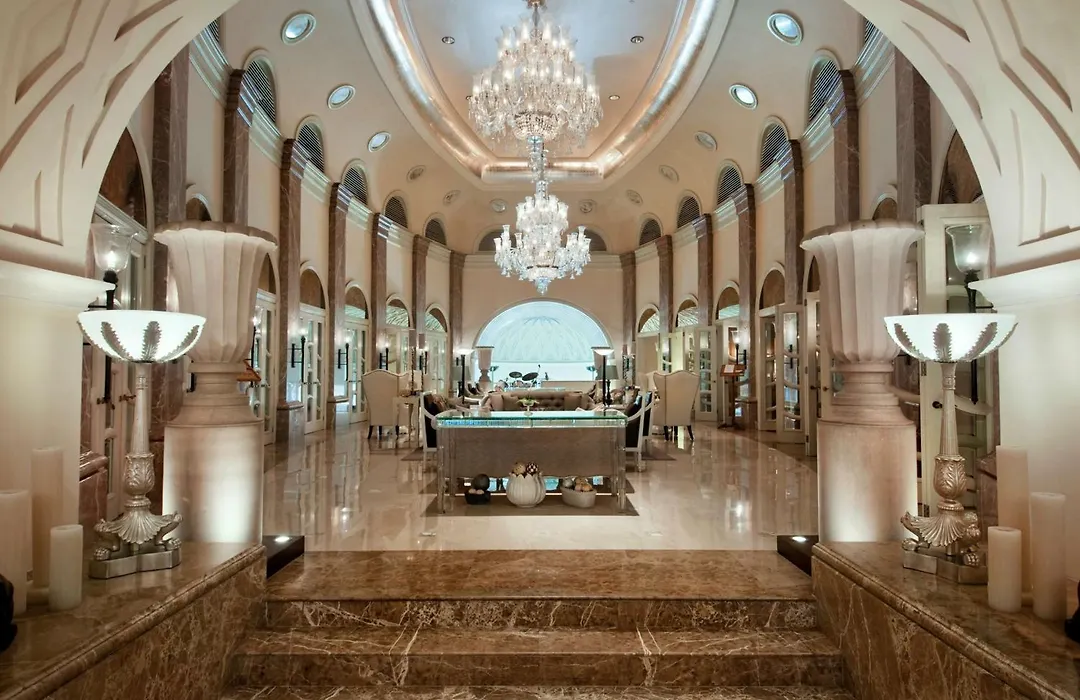 Leisure facilities include an outdoor pool surrounded by lush greenery, a sauna, and a fitness center. For business events, the hotel offers five grand halls and a ballroom suitable for large gatherings.
