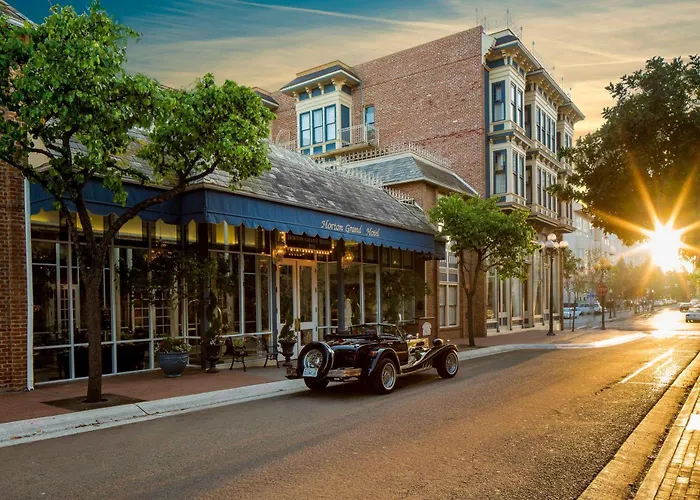 Guest rooms at Horton Grand Hotel include antique furnishings, marble-framed gas fireplaces, and modern amenities such as flat-screen TVs and coffee/tea makers. The hotel also features ADA accessible rooms with enhanced features.