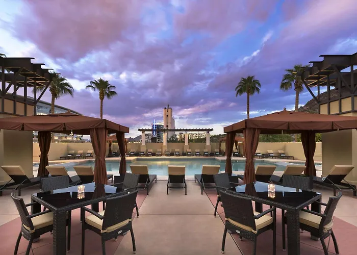 Tempe Mission Palms offers a 4-star experience complemented by an outdoor heated rooftop swimming pool and on-site dining options, including the Mission Grille and Harry's Place. The hotel features modern Arizona decor and is conveniently located within the bustling Mill Avenue district, allowing easy access to shops and eateries.
