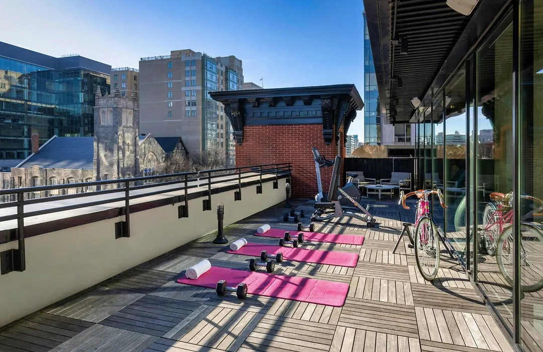 Leisure options include a fitness center equipped with Peloton bikes and an outdoor terrace for yoga. The lobby features gathering areas with board games and foosball, promoting social interaction among guests. The hotel is conveniently located within walking distance to numerous museums and landmarks.