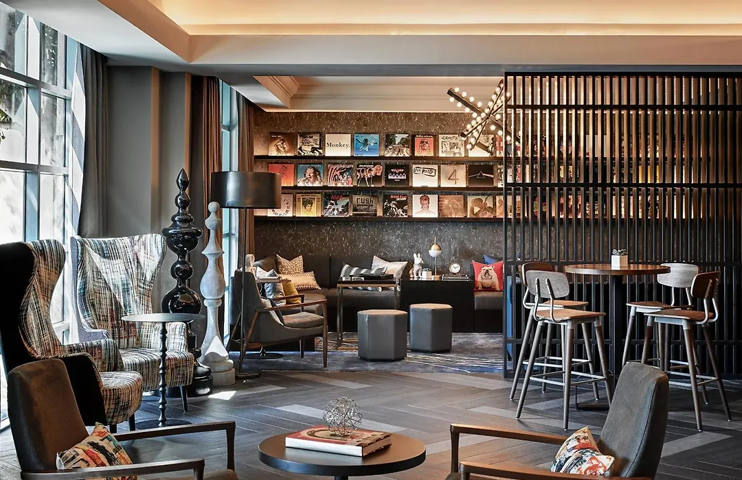 Dining options include Studio 12 Restaurant & Lounge offering California cuisine and craft beers. Illy Café serves coffee and breakfast items, while room service is available through an app for in-room dining. The lounge provides all-day snacks and drinks.