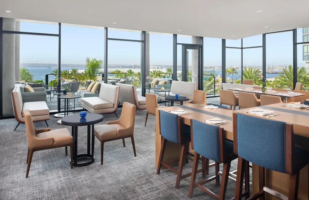 The guest rooms feature floor-to-ceiling windows showcasing beautiful views of the San Diego skyline and bay. Each room includes a Keurig coffeemaker, mini-bar, and luxurious marble bathrooms. The hotel is pet-friendly, catering to travelers with furry companions.
