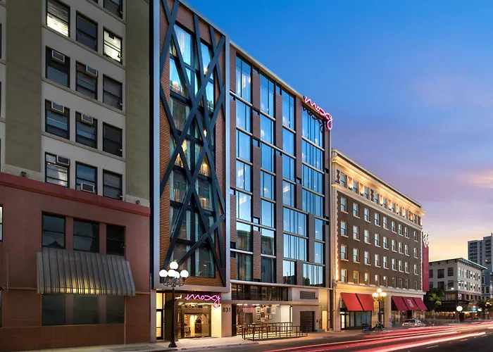 Moxy San Diego Gaslamp Quarter, a 3-star San Diego hotel rated 8.1/10 on Booking.com, features modern amenities and a fun vibe in the Downtown district. Guests have access to a fitness center, 24-hour front desk, and Bar Moxy, the hotel's social hub.