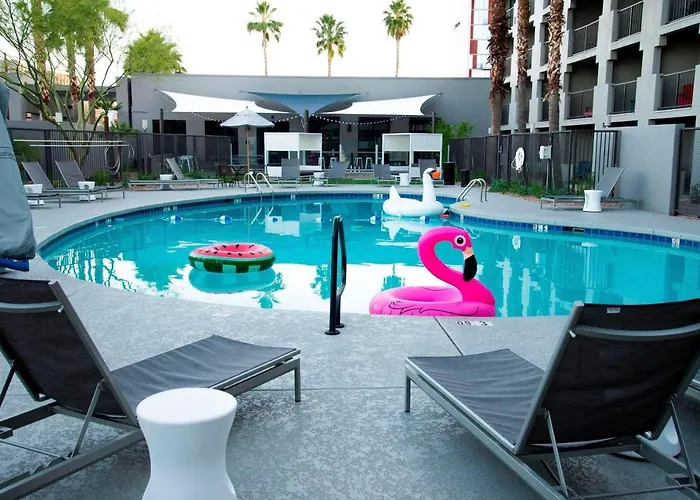 Moxy Phoenix Tempe/ASU Area is a 3-star hotel featuring urban-inspired accommodation with vibrant amenities. Guests can explore the area's entertainment and dining options, along with an outdoor pool and 24/7 grab & go snack offerings. This pet-friendly Tempe hotel has a Booking.com rating of 7.4/10.