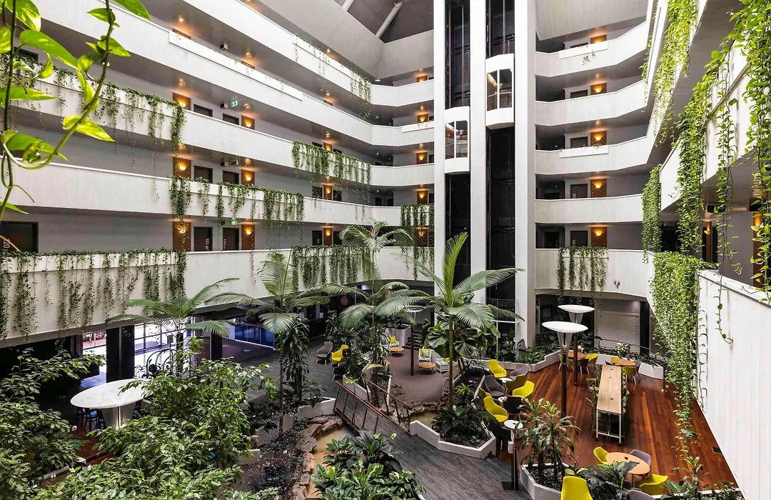 Leisure facilities feature a swimming pool, a spa, and an atrium with an indoor tropical rainforest, complete with a waterfall. The hotel caters to business needs with a dedicated office area that promotes productivity in a comfortable setting.